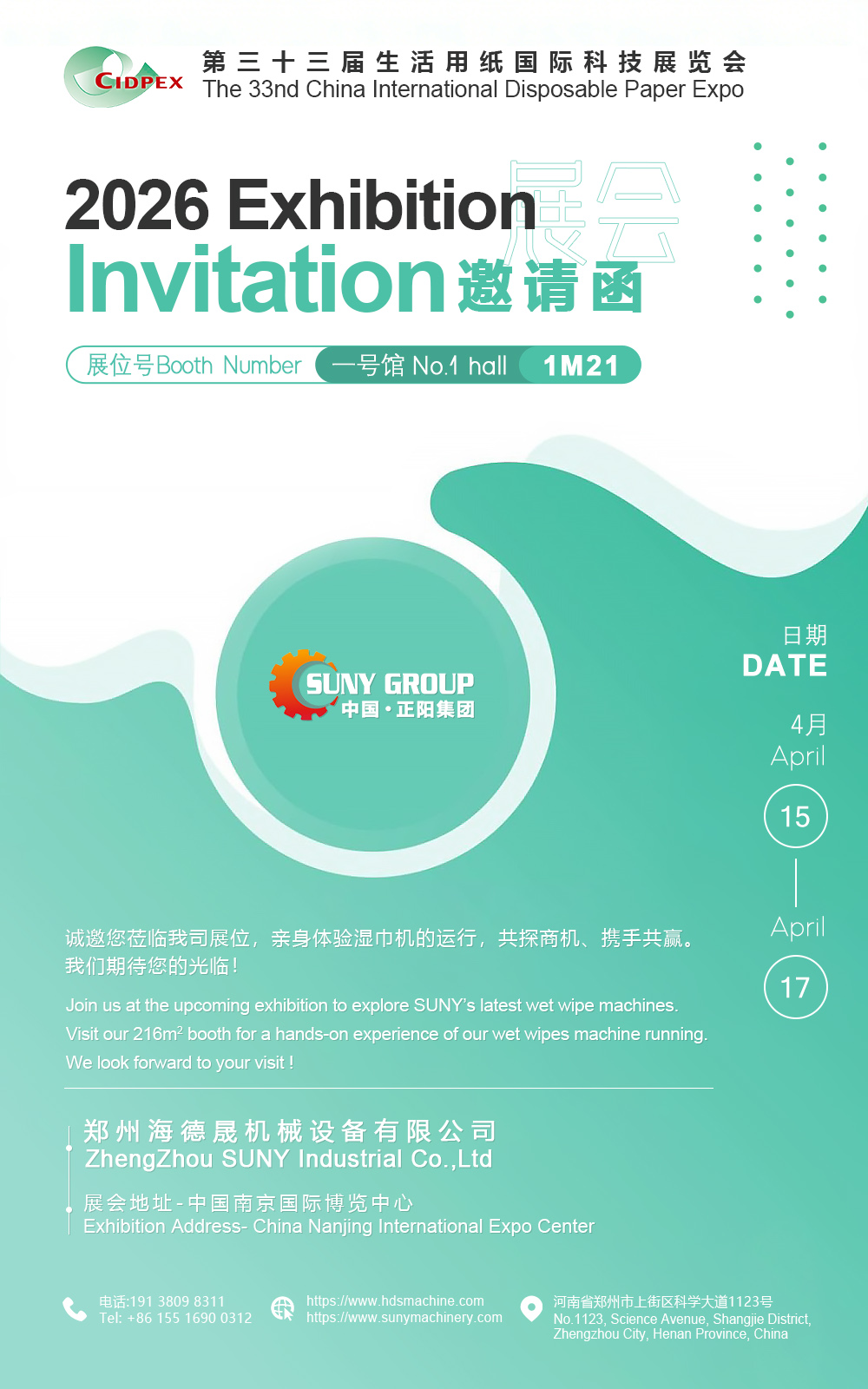 萬象更新,盛會啟幕。鄭州海德晟機械誠摯邀請您與2026年4月15日至17日,蒞臨南京國際博覽中心,參觀第33屆生活用紙國際科技展覽會。我們已整裝待發,恭候您在一號館1M21展位相聚,共襄行業盛舉。